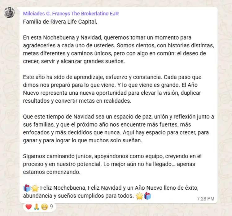 “Bienvenido a Rivera Life Capital. Aquí trabajamos como familia: nos apoyamos, crecemos juntos y avanzamos con disciplina, visión y propósito.”