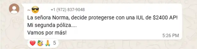 “Norma decidió protegerse con un IUL de $2,400 AP. ¡Su segunda póliza! Nos encanta acompañar decisiones que construyen futuro.”